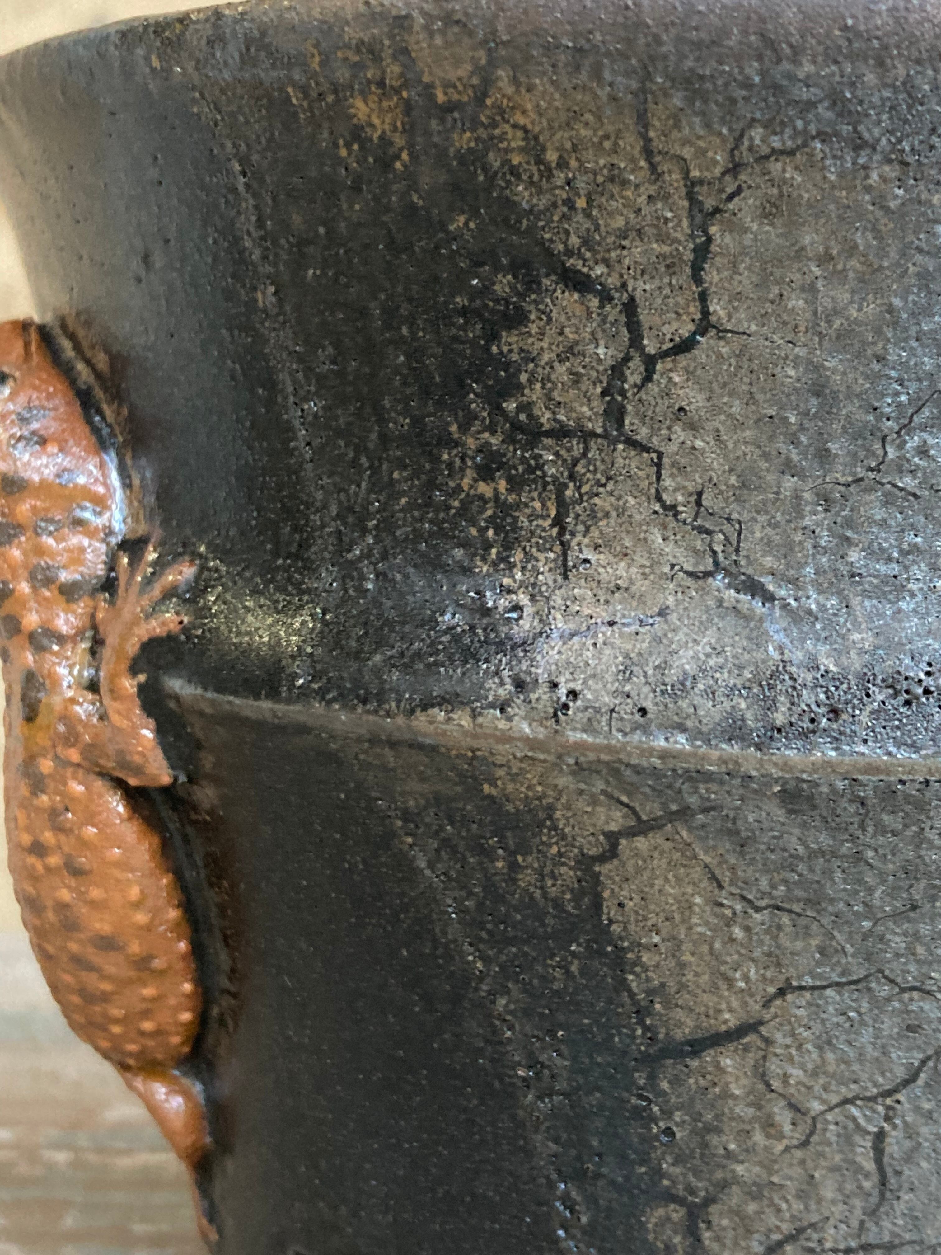 炭化で仕上げた黒マットの鉢になります。こちらの鉢は窯変の為、黒色と一部灰マット色2色を楽しめます(トカゲモドキはやや光沢のある茶色)